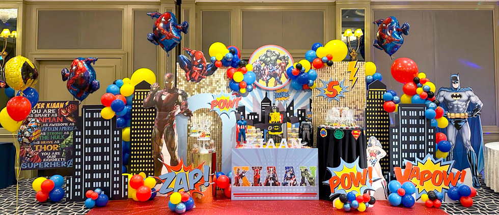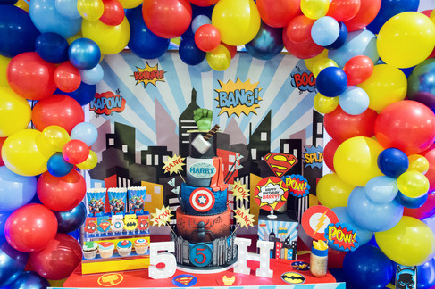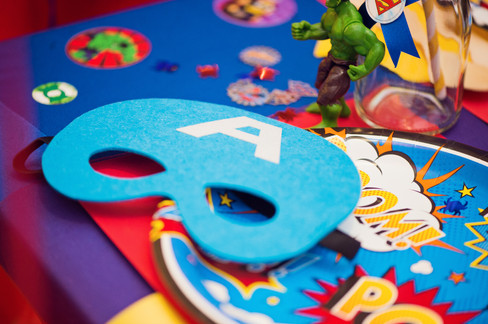 With many heroes to choose from, our styling team display a variety of cutouts, superhero logo cookies and cupcakes and bespoke “Bang”, “Pow” and “Zap” confetti.